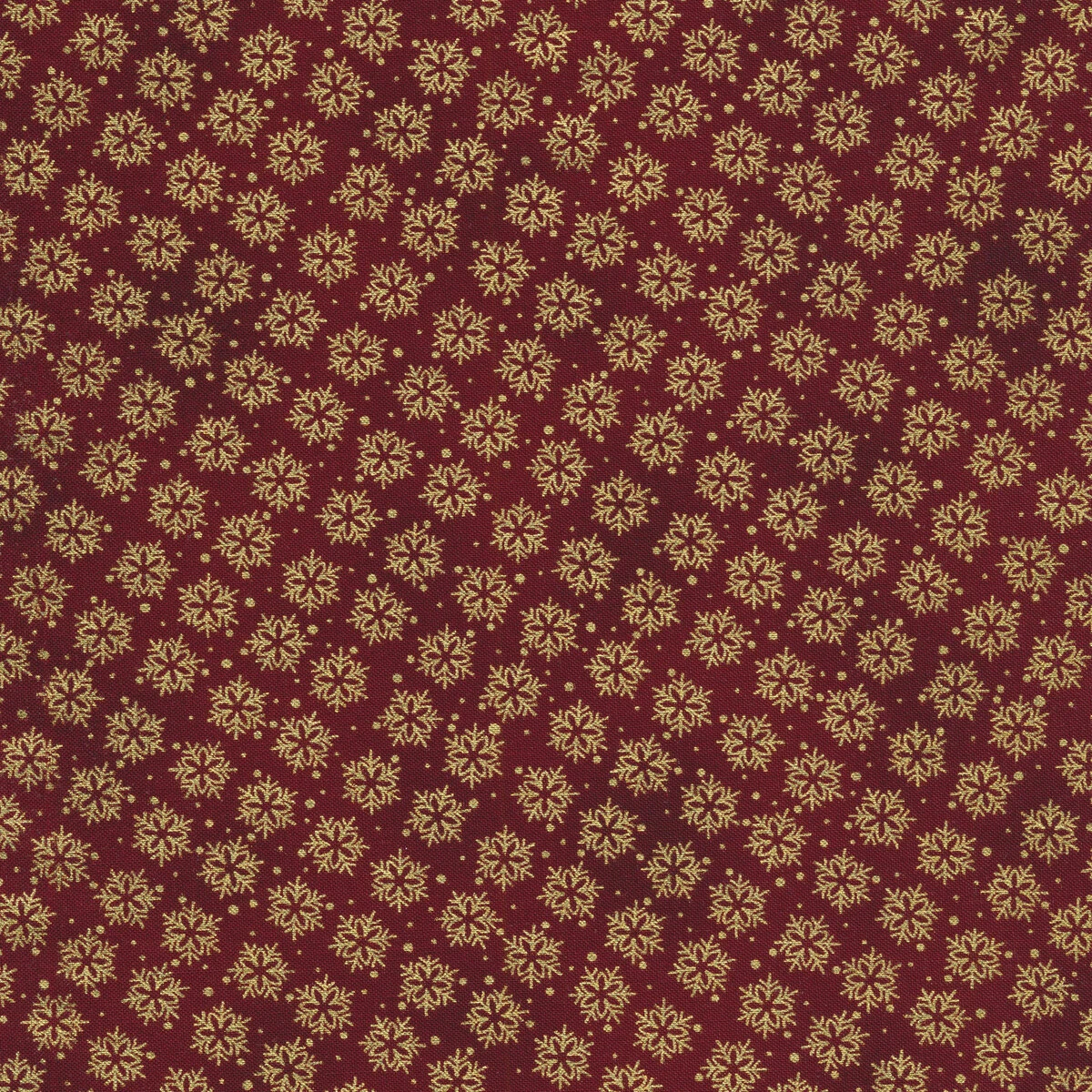 Twinkle by Stof Fabrics is another beautiful addition to the Stof Christmas line which features gold metallic accented Christmas prints with leaves, vines, snowflakes, stars, and more, all in traditional blue, green, and red colors. Add some metallic shine to any Christmas project with this dark red mottled fabric with gold metallic snowflakes all over.