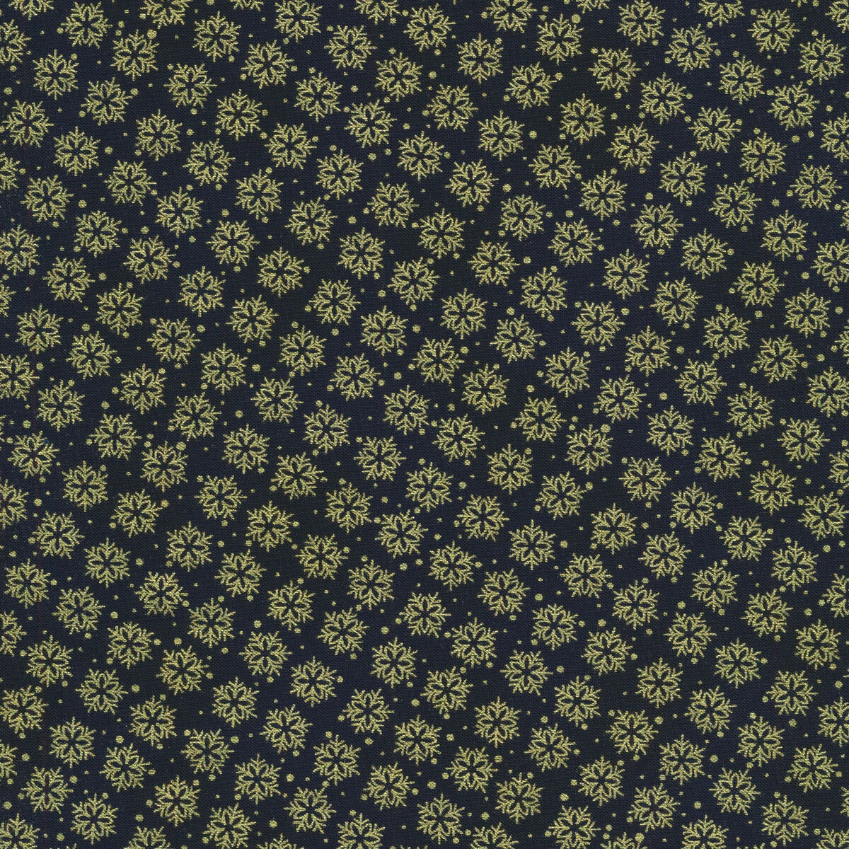 Twinkle by Stof Fabrics is another beautiful addition to the Stof Christmas line which features gold metallic accented Christmas prints with leaves, vines, snowflakes, stars, and more, all in traditional blue, green, and red colors. Add some metallic shine to any Christmas project with this dark blue mottled fabric with gold metallic snowflakes all over.