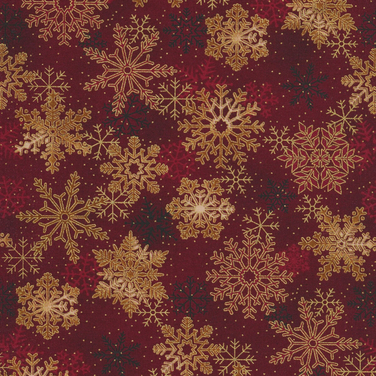 Twinkle by Stof Fabrics is another beautiful addition to the Stof Christmas line which features gold metallic accented Christmas prints with leaves, vines, snowflakes, stars, and more, all in traditional blue, green, and red colors. Add some metallic shine to any Christmas project with this dark red mottled fabric with large gold metallic snowflakes all over.