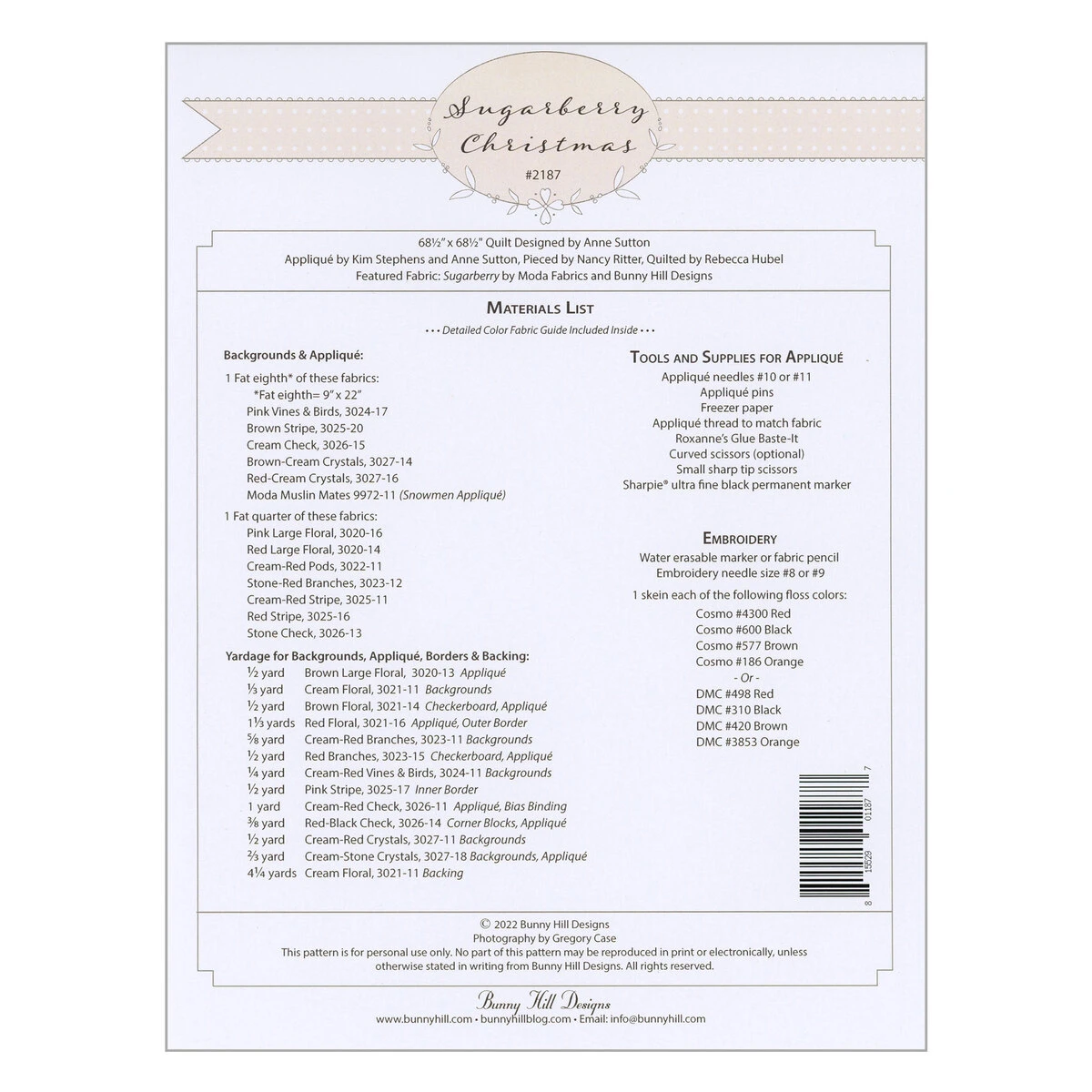 The Sugarberry Christmas Quilt Pattern by Anne Sutton for Bunny Hill Designs is a great choice for your next Christmas project! Quilt this little town from the center out, and you can complete it in time to enjoy it for the holiday season and many more to come! Originally designed as a 7 month Block of the Month (BOM) quilt, this packet contains all 7 block patterns and templates for each block.