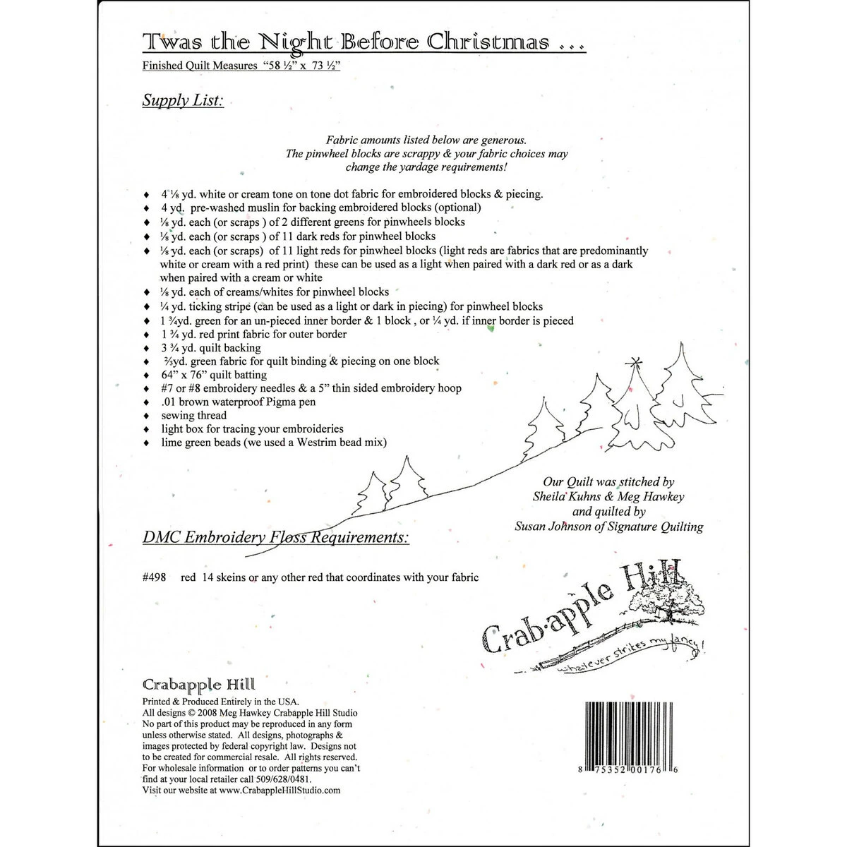 The children are snug in their beds and Santa’s just left the North Pole with a sleigh full of toys! Hand stitch together Santa’s village by Meg Hawkey for Crabapple Hill Studio on this adorable 58-1/2″ x 78-1/2″ redwork quilt.